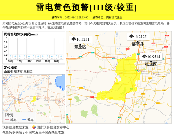 周村区气象台2022年08月12日21时13分发布雷电黄色预警信号:预计今天夜间到明天白天,我区全部镇和街道将出现雷电活动,并伴有短时强降水和7-8级雷雨阵风。请注意防范! 信息来源:国家预警信息发布中心; 发布单位:周村区气象台。