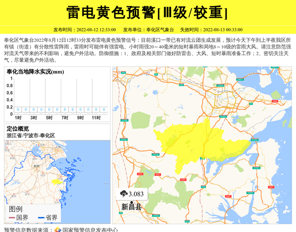 奉化区气象台2022年8月12日12时33分发布雷电黄色预警信号:目前溪口一带已有对流云团生成发展,预计今天下午到上半夜我区所有镇(街道)有分散性雷阵雨,雷雨时可能伴有强雷电、小时雨强20~40毫米的短时暴雨和局地8~10级的雷雨大风。请注意防范强对流天气带来的不利影响,避免户外活动。防御措施:1、政府及相关部门做好防雷击、大风、短时暴雨准备工作;2、密切关注天气,尽量避免户外活动。 信息来源:国家预警信息发布中心; 发布单位:奉化区气象台。