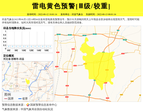 邱县气象台2022年08月12日18时00分发布雷电黄色预警信号:预计今天傍晚到明天上午我县全部乡镇将出现雷雨天气,雷雨时可能伴有短时强降水、短时大风等强对流天气,请有关单位和人员做好防范准备。 信息来源:国家预警信息发布中心; 发布单位:邱县气象台。