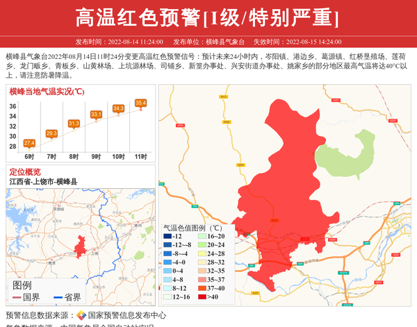 横峰县气象台2022年08月14日11时24分变更高温红色预警信号:预计未来24小时内,岑阳镇、港边乡、葛源镇、红桥垦殖场、莲荷乡、龙门畈乡、青板乡、山黄林场、上坑源林场、司铺乡、新篁办事处、兴安街道办事处、姚家乡的部分地区最高气温将达40°C以上,请注意防暑降温。 信息来源:国家预警信息发布中心; 发布单位:横峰县气象台。