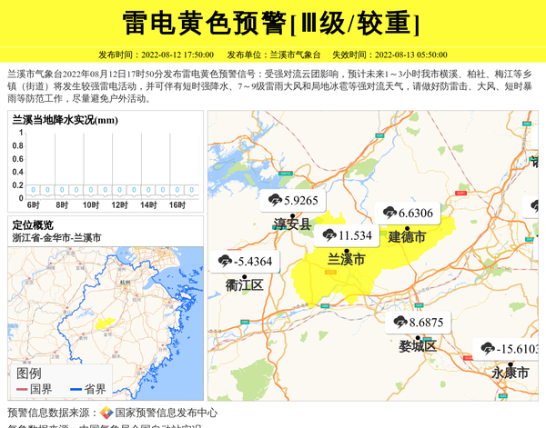兰溪市气象台发布雷电黄色预警[Ⅲ级/较重] 相关文章