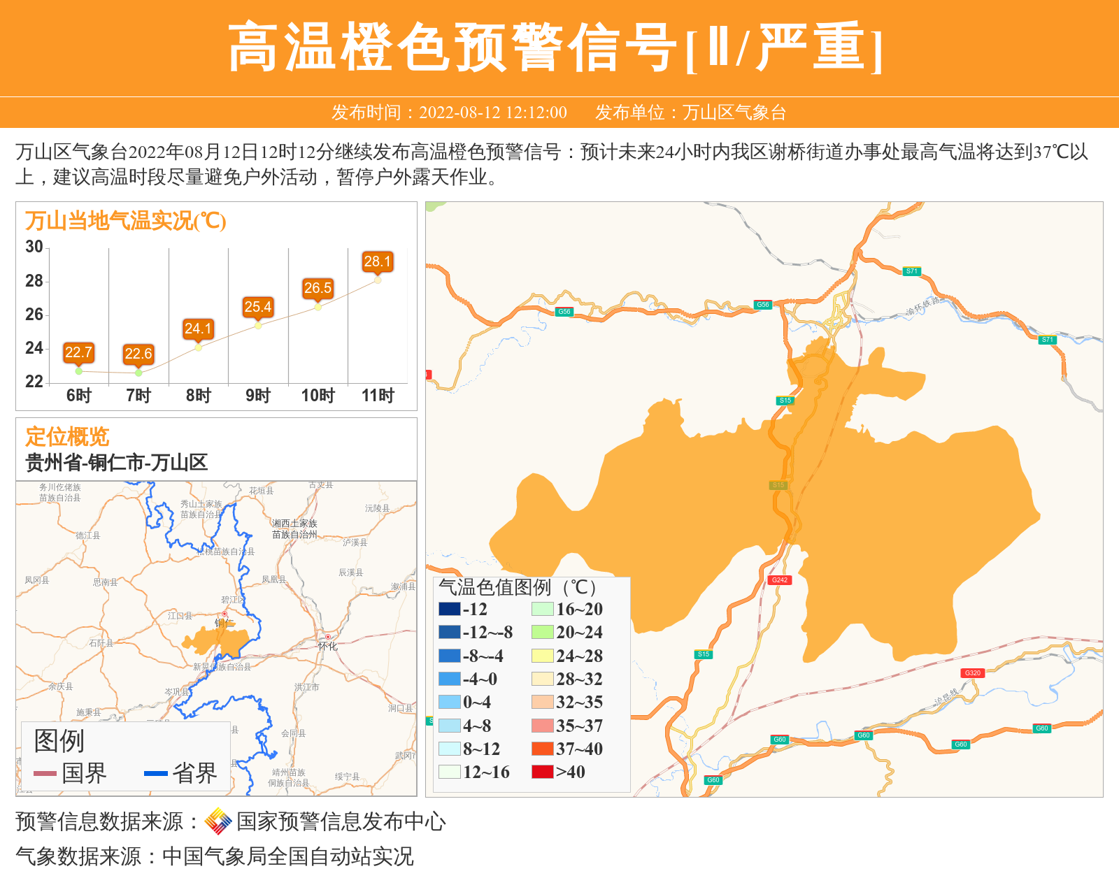 万山区气象台2022年08月12日12时12分继续发布高温橙色预警信号:预计未来24小时内我区谢桥街道办事处最高气温将达到37℃以上,建议高温时段尽量避免户外活动,暂停户外露天作业。 信息来源:国家预警信息发布中心; 发布单位:万山区气象台。