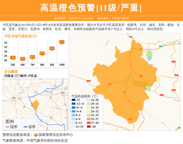 卢氏县气象台2022年8月13日19时38分发布高温橙色预警信号:预计今天白天卢氏县双龙湾、徐家湾、沙河、城关、东明、横涧、文峪、范里、五里川、瓦窑沟、朱阳关、杜关、潘河、木桐等乡镇最高气温将升至37℃以上,局部40℃以上,请注意防范。 信息来源:国家预警信息发布中心; 发布单位:卢氏县气象局。