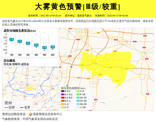 成安县气象台2022年08月14日06时43分发布大雾黄色预警信号:目前我县已出现能见度小于500米的大雾天气且仍将持续,请有关单位和人员做好防范准备。 信息来源:国家预警信息发布中心; 发布单位:成安县气象台。
