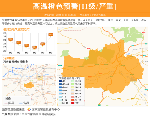 登封市气象台2022年08月13日08时25分继续发布高温橙色预警信号:预计今天白天,登封市区、唐庄、宣化、大冶、大金店、卢店等部分乡镇(街道)最高气温将升至37℃以上,请注意防范高温天气带来的不利影响。 信息来源:国家预警信息发布中心; 发布单位:登封市气象局。