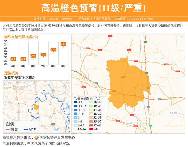 太和县气象台2022年08月13日09时55分继续发布高温橙色预警信号。24小时内城关镇、关集镇、旧县镇等大部分乡镇最高气温将升至37℃以上,请注意防暑降温! 信息来源:国家预警信息发布中心; 发布单位:太和县气象局。