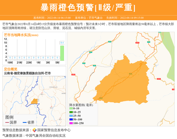 芒市气象台2022年8月14日6时15分升级发布暴雨橙色预警信号:预计未来3小时,芒市双坡地区降雨量将达50毫米以上,芒市镇大部地区强降雨将持续,请注意防范山洪、滑坡、泥石流、城镇内涝等灾害。 信息来源:国家预警信息发布中心; 发布单位:芒市气象台。