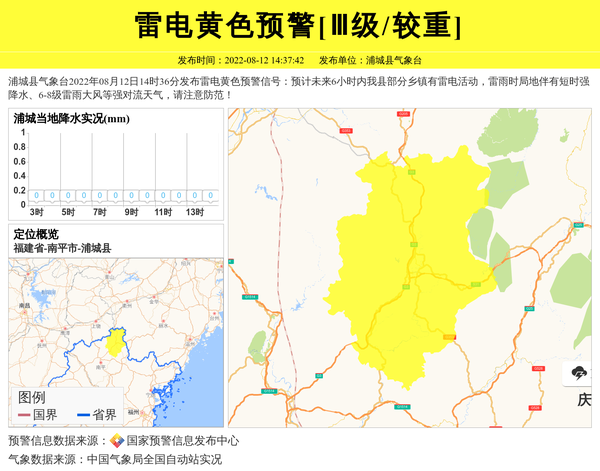 浦城县气象台2022年08月12日14时36分发布雷电黄色预警信号:预计未来6小时内我县部分乡镇有雷电活动,雷雨时局地伴有短时强降水、6-8级雷雨大风等强对流天气,请注意防范! 信息来源:国家预警信息发布中心; 发布单位:浦城县气象台。