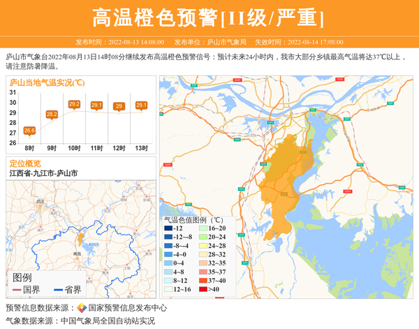 庐山市气象台2022年08月13日14时08分继续发布高温橙色预警信号:预计未来24小时内,我市大部分乡镇最高气温将达37℃以上,请注意防暑降温。 信息来源:国家预警信息发布中心; 发布单位:庐山市气象局。