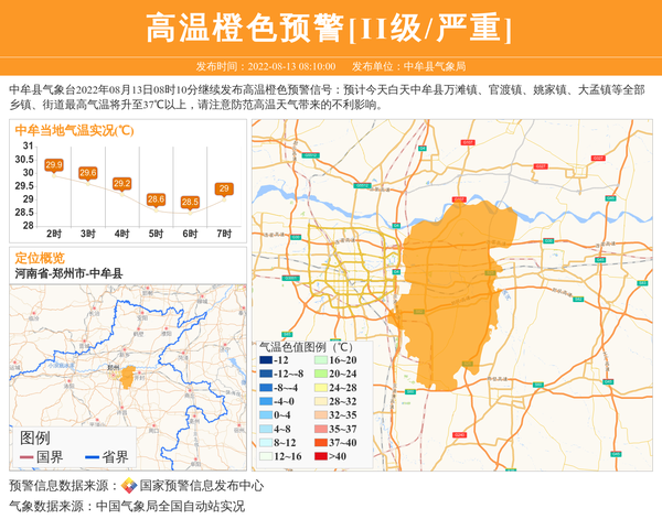 中牟县气象台2022年08月13日08时10分继续发布高温橙色预警信号:预计今天白天中牟县万滩镇、官渡镇、姚家镇、大孟镇等全部乡镇、街道最高气温将升至37℃以上,请注意防范高温天气带来的不利影响。 信息来源:国家预警信息发布中心; 发布单位:中牟县气象局。