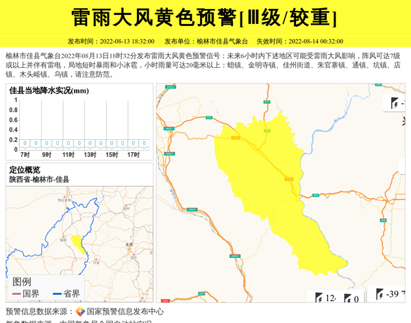 榆林市佳县气象台2022年08月13日18时32分发布雷雨大风黄色预警信号:未来6小时内下述地区可能受雷雨大风影响,阵风可达7级或以上并伴有雷电,局地短时暴雨和小冰雹,小时雨量可达20毫米以上:螅镇、金明寺镇、佳州街道、朱官寨镇、通镇、坑镇、店镇、木头峪镇、乌镇,请注意防范。 信息来源:国家预警信息发布中心; 发布单位:榆林市佳县气象台。