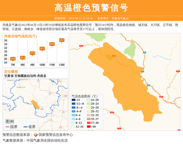 舟曲县气象台2022年08月13日12时38分继续发布高温橙色预警信号:预计24小时内,我县曲告纳镇、城关镇、大川镇、立节镇、憨班镇、江盘镇、南峪乡、峰迭镇等部分地区最高气温将升至37℃以上,请加强防范。 信息来源:国家预警信息发布中心; 发布单位:舟曲县气象台。