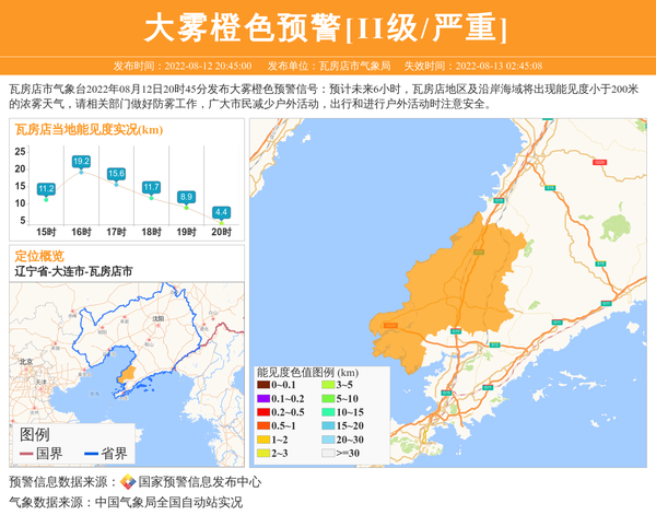 瓦房店市气象台2022年08月12日20时45分发布大雾橙色预警信号:预计未来6小时,瓦房店地区及沿岸海域将出现能见度小于200米的浓雾天气,请相关部门做好防雾工作,广大市民减少户外活动,出行和进行户外活动时注意安全。 信息来源:国家预警信息发布中心; 发布单位:瓦房店市气象局。