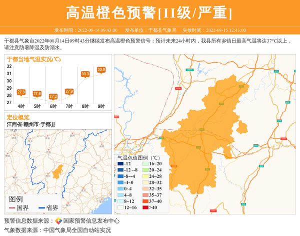 于都县气象台2022年08月14日09时43分继续发布高温橙色预警信号:预计未来24小时内,我县所有乡镇日最高气温将达37°C以上,请注意防暑降温及防溺水。 信息来源:国家预警信息发布中心; 发布单位:于都县气象局。