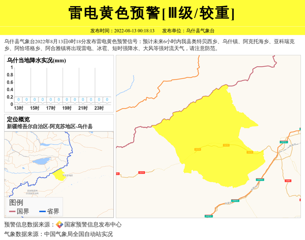 乌什县气象台2022年8月13日0时18分发布雷电黄色预警信号:预计未来6小时内我县奥特贝西乡、乌什镇、阿克托海乡、亚科瑞克乡、阿恰塔格乡、阿合雅镇将出现雷电、冰雹、短时强降水、大风等强对流天气,请注意防范。 信息来源:国家预警信息发布中心; 发布单位:乌什县气象台。