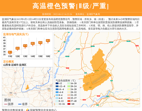盐湖区气象台2022年8月12日16时22分变更发布高温橙色预警信号,预警区域:所有乡、镇(街道)。预计未来24小时预警区域内日最高气温将升至37℃以上。请有关单位和人员做好防范准备。 防御指南: 1.有关部门和单位按照职责落实防暑降温保障措施; 2.尽量避免在高温时段进行户外活动,高温条件下作业的人员应当缩短连续工作时间; 3.对老、弱、病、幼人群提供防暑降温指导,并采取必要的防护措施; 4.有关部门和单位应当注意防范因用电量过高,以及电线、变压器等电力负载过大而引发的火灾。 信息来源:国家预警信息发布中心; 发布单位:盐湖区气象局。