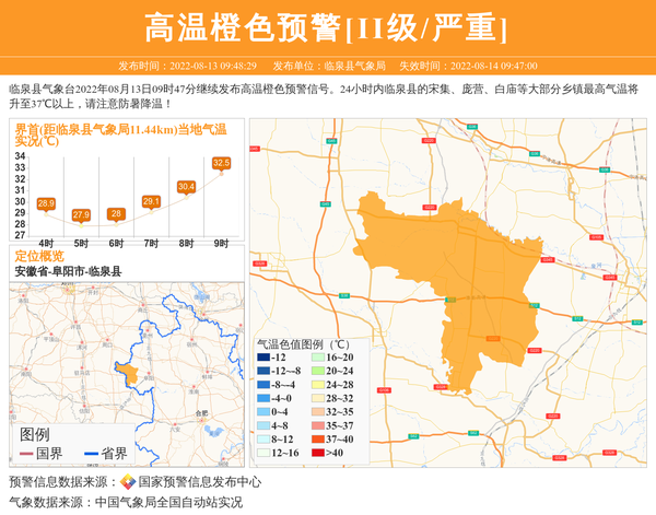 临泉县气象台2022年08月13日09时47分继续发布高温橙色预警信号。24小时内临泉县的宋集、庞营、白庙等大部分乡镇最高气温将升至37℃以上,请注意防暑降温! 信息来源:国家预警信息发布中心; 发布单位:临泉县气象局。