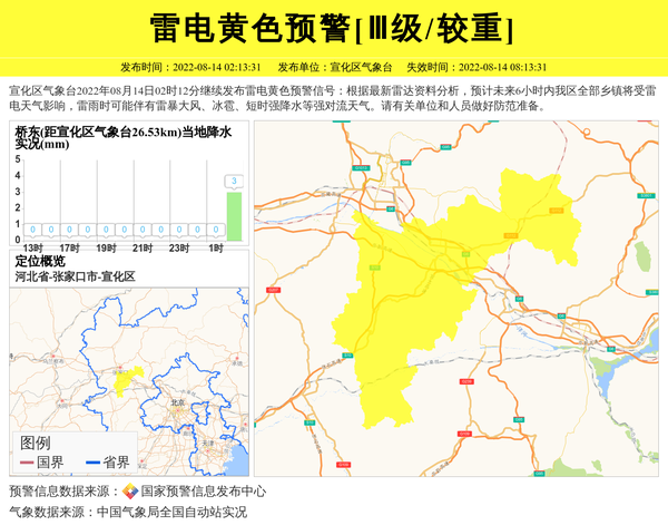 宣化区气象台2022年08月14日02时12分继续发布雷电黄色预警信号:根据最新雷达资料分析,预计未来6小时内我区全部乡镇将受雷电天气影响,雷雨时可能伴有雷暴大风、冰雹、短时强降水等强对流天气。请有关单位和人员做好防范准备。 信息来源:国家预警信息发布中心; 发布单位:宣化区气象台。