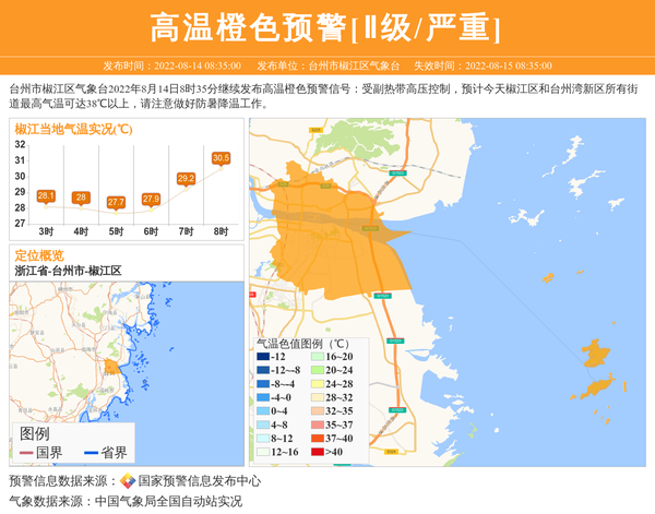 台州市椒江区气象台2022年8月14日8时35分继续发布高温橙色预警信号:受副热带高压控制,预计今天椒江区和台州湾新区所有街道最高气温可达38℃以上,请注意做好防暑降温工作。 信息来源:国家预警信息发布中心; 发布单位:台州市椒江区气象台。