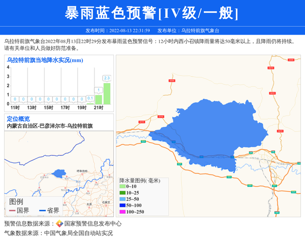 乌拉特前旗气象台2022年08月13日22时29分发布暴雨蓝色预警信号:12小时内西小召镇降雨量将达50毫米以上,且降雨仍将持续。请有关单位和人员做好防范准备。 信息来源:国家预警信息发布中心; 发布单位:乌拉特前旗气象台。