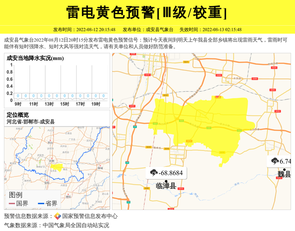 成安县气象台2022年08月12日20时15分发布雷电黄色预警信号:预计今天夜间到明天上午我县全部乡镇将出现雷雨天气,雷雨时可能伴有短时强降水、短时大风等强对流天气,请有关单位和人员做好防范准备。 信息来源:国家预警信息发布中心; 发布单位:成安县气象台。