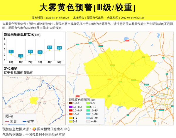大雾黄色预警信号:预计14日5时到9时,新民市将出现能见度小于500米的大雾天气,请注意防范大雾天气对生产生活造成的不利影响。新民市气象台2022年8月14日5时22分发布 信息来源:国家预警信息发布中心; 发布单位:新民市气象局。