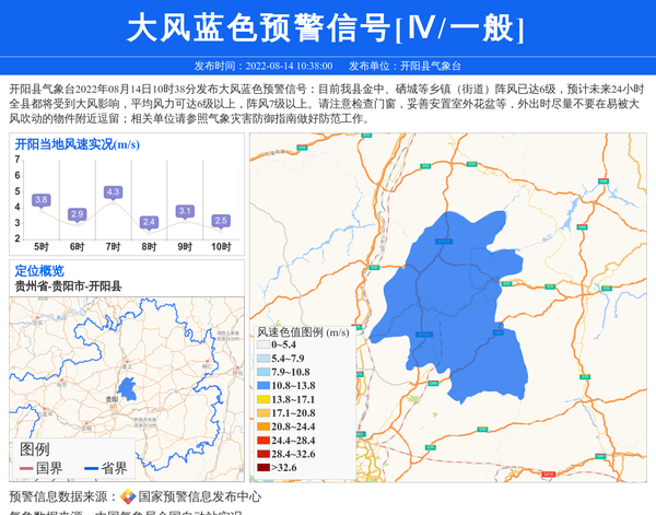 开阳县气象台2022年08月14日10时38分发布大风蓝色预警信号:目前我县金中、硒城等乡镇(街道)阵风已达6级,预计未来24小时全县都将受到大风影响,平均风力可达6级以上,阵风7级以上。请注意检查门窗,妥善安置室外花盆等,外出时尽量不要在易被大风吹动的物件附近逗留;相关单位请参照气象灾害防御指南做好防范工作。 信息来源:国家预警信息发布中心; 发布单位:开阳县气象台。