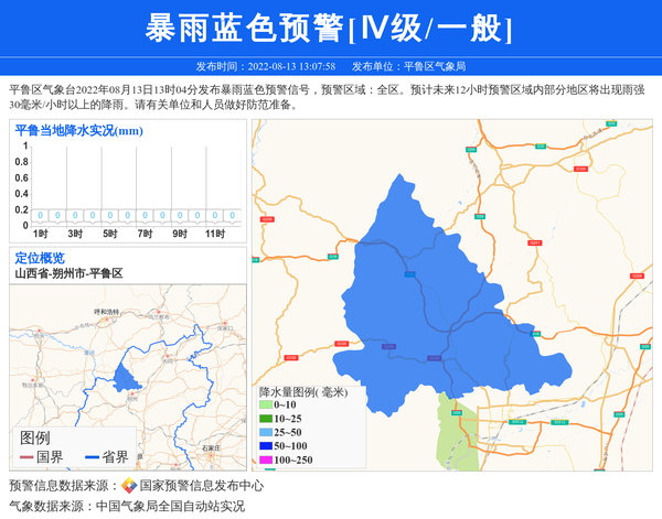平鲁区气象台2022年08月13日13时04分发布暴雨蓝色预警信号,预警区域:全区。预计未来12小时预警区域内部分地区将出现雨强30毫米/小时以上的降雨。请有关单位和人员做好防范准备。 信息来源:国家预警信息发布中心; 发布单位:平鲁区气象局。