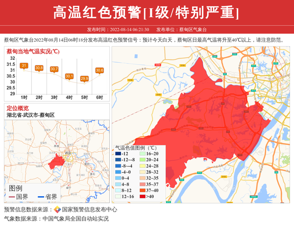 蔡甸区气象台2022年08月14日06时18分发布高温红色预警信号:预计今天白天,蔡甸区日最高气温将升至40℃以上,请注意防范。 信息来源:国家预警信息发布中心; 发布单位:蔡甸区气象台。