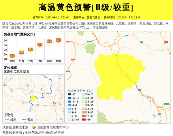 陇县气象台2022年08月12日15时23分发布高温黄色预警信号:预计未来三天我县城关镇、八渡镇、固关镇、新集川镇、河北镇、东南镇、温水镇、曹家湾镇、天成镇、东风镇日最高气温将达35℃以上,请注意防范。 信息来源:国家预警信息发布中心; 发布单位:陇县气象台。