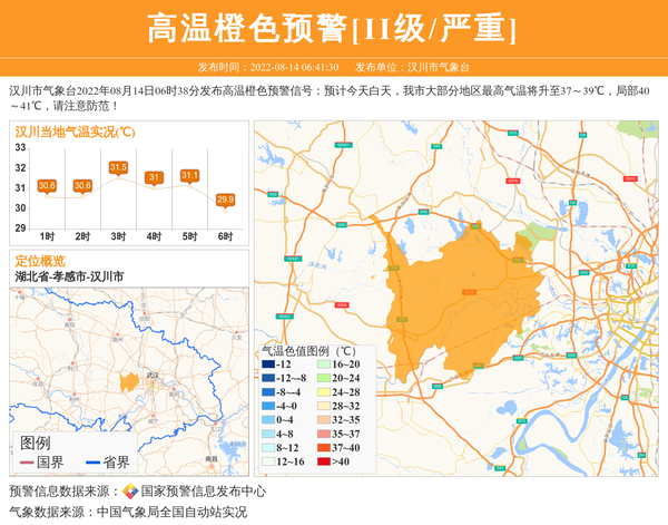 汉川市气象台2022年08月14日06时38分发布高温橙色预警信号:预计今天白天,我市大部分地区最高气温将升至37~39℃,局部40~41℃,请注意防范! 信息来源:国家预警信息发布中心; 发布单位:汉川市气象台。