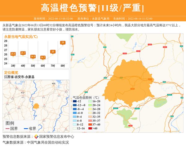永新县气象台2022年08月13日08时52分继续发布高温橙色预警信号:预计未来24小时内,我县大部分地方最高气温将达37°C以上,请注意防暑降温,家长朋友注意看管好小孩,谨防溺水。 信息来源:国家预警信息发布中心; 发布单位:永新县气象局。