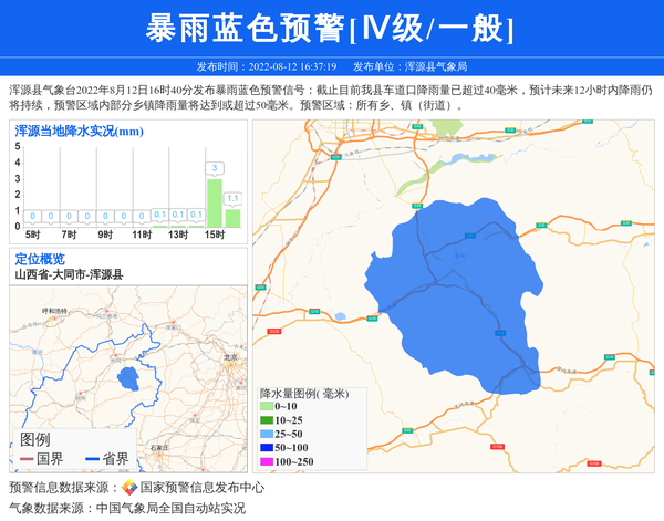 浑源县气象台2022年8月12日16时40分发布暴雨蓝色预警信号:截止目前我县车道口降雨量已超过40毫米,预计未来12小时内降雨仍将持续,预警区域内部分乡镇降雨量将达到或超过50毫米。预警区域:所有乡、镇(街道)。 信息来源:国家预警信息发布中心; 发布单位:浑源县气象局。