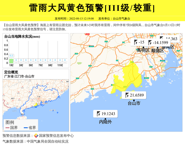 【台山雷雨大风黄色预警】海面上有雷雨云团北抬,预计未来3小时我市有雷雨,间中伴有7到8级阵风,台山市气象台8月13日12时15分发布雷雨大风黄色预警信号,请注意防御。 信息来源:国家预警信息发布中心; 发布单位:台山市气象台。