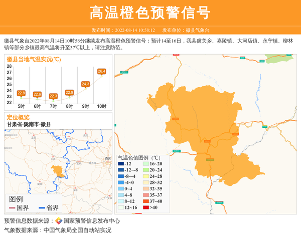 徽县气象台2022年08月14日10时58分继续发布高温橙色预警信号:预计14至16日,我县虞关乡、嘉陵镇、大河店镇、永宁镇、柳林镇等部分乡镇最高气温将升至37℃以上,请注意防范。 信息来源:国家预警信息发布中心; 发布单位:徽县气象台。