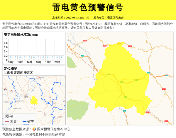 安定区气象台2022年08月13日21时11分发布雷电黄色预警信号:预计6小时内,我区鲁家沟镇、葛家岔镇、白碌乡、石峡湾乡等部分地区可能发生雷电活动,可能会造成雷电灾害事故。请有关单位和人员做好防范准备! 信息来源:国家预警信息发布中心; 发布单位:安定区气象台。