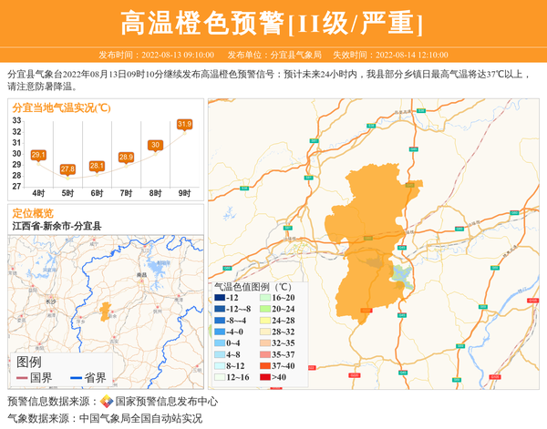 分宜县气象台2022年08月13日09时10分继续发布高温橙色预警信号:预计未来24小时内,我县部分乡镇日最高气温将达37℃以上,请注意防暑降温。 信息来源:国家预警信息发布中心; 发布单位:分宜县气象局。
