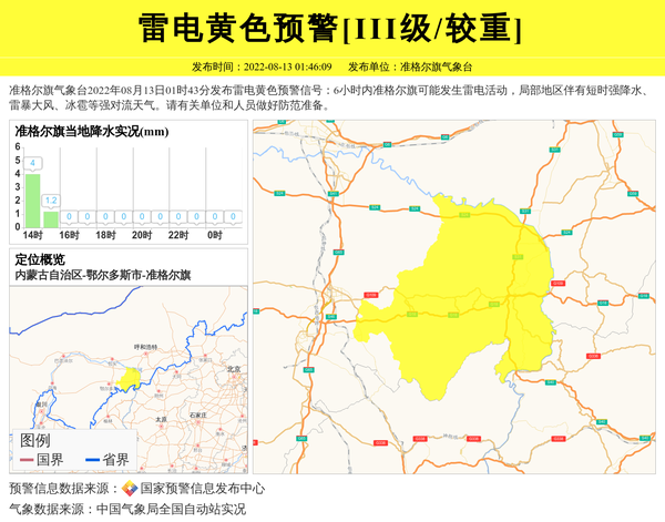 准格尔旗气象台2022年08月13日01时43分发布雷电黄色预警信号:6小时内准格尔旗可能发生雷电活动,局部地区伴有短时强降水、雷暴大风、冰雹等强对流天气。请有关单位和人员做好防范准备。 信息来源:国家预警信息发布中心; 发布单位:准格尔旗气象台。