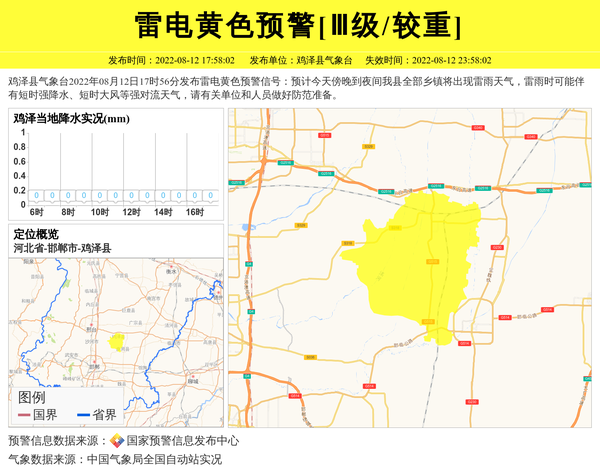 鸡泽县气象台2022年08月12日17时56分发布雷电黄色预警信号:预计今天傍晚到夜间我县全部乡镇将出现雷雨天气,雷雨时可能伴有短时强降水、短时大风等强对流天气,请有关单位和人员做好防范准备。 信息来源:国家预警信息发布中心; 发布单位:鸡泽县气象台。