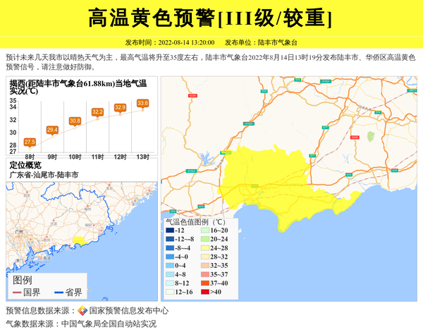 预计未来几天我市以晴热天气为主,最高气温将升至35度左右,陆丰市气象台2022年8月14日13时19分发布陆丰市、华侨区高温黄色预警信号,请注意做好防御。 信息来源:国家预警信息发布中心; 发布单位:陆丰市气象台。