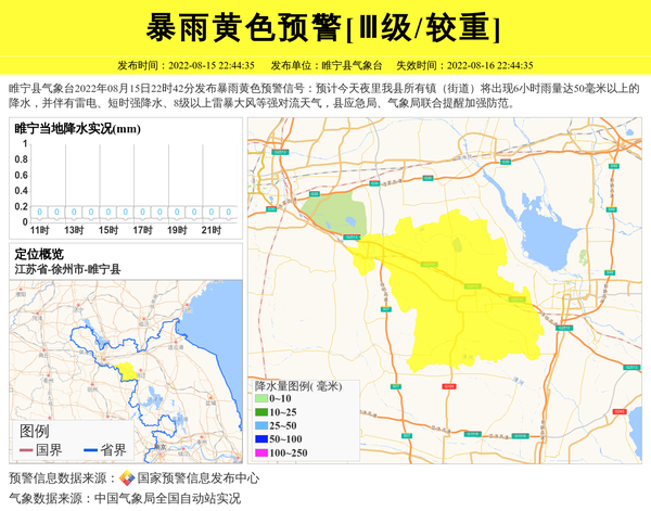 睢宁县气象台2022年08月15日22时42分发布暴雨黄色预警信号:预计今天夜里我县所有镇(街道)将出现6小时雨量达50毫米以上的降水,并伴有雷电、短时强降水、8级以上雷暴大风等强对流天气,县应急局、气象局联合提醒加强防范。 信息来源:国家预警信息发布中心; 发布单位:睢宁县气象台。