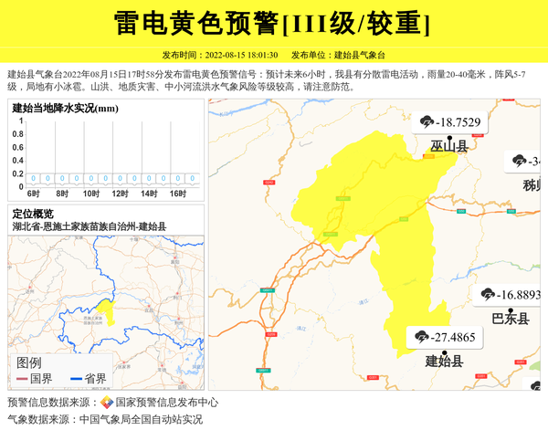建始县气象台2022年08月15日17时58分发布雷电黄色预警信号:预计未来6小时,我县有分散雷电活动,雨量20-40毫米,阵风5-7级,局地有小冰雹。山洪、地质灾害、中小河流洪水气象风险等级较高,请注意防范。 信息来源:国家预警信息发布中心; 发布单位:建始县气象台。