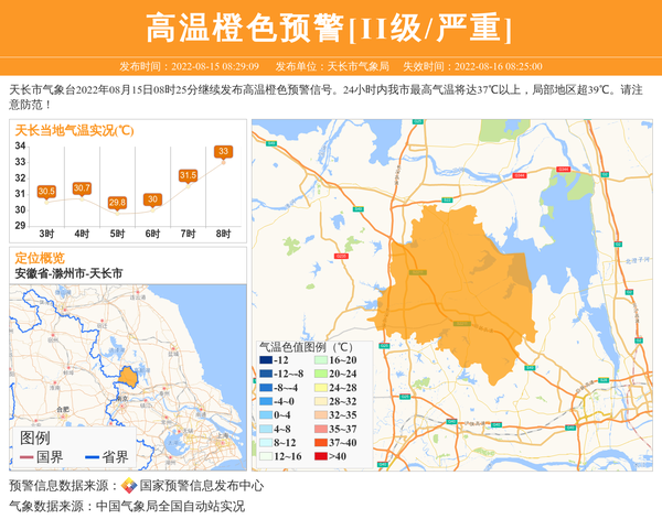 天长市气象台2022年08月15日08时25分继续发布高温橙色预警信号。24小时内我市最高气温将达37℃以上,局部地区超39℃。请注意防范! 信息来源:国家预警信息发布中心; 发布单位:天长市气象局。