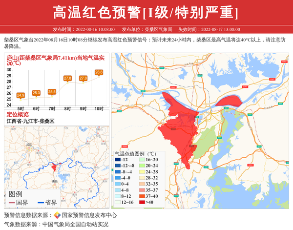 柴桑区气象台2022年08月16日10时08分继续发布高温红色预警信号:预计未来24小时内,柴桑区最高气温将达40°C以上,请注意防暑降温。 信息来源:国家预警信息发布中心; 发布单位:柴桑区气象局。