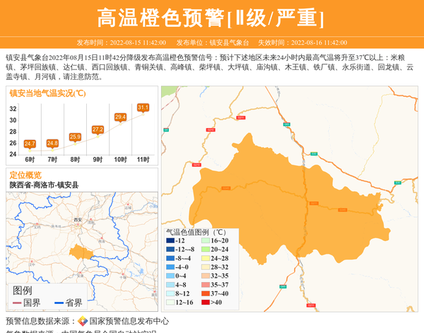 镇安县气象台2022年08月15日11时42分降级发布高温橙色预警信号:预计下述地区未来24小时内最高气温将升至37℃以上:米粮镇、茅坪回族镇、达仁镇、西口回族镇、青铜关镇、高峰镇、柴坪镇、大坪镇、庙沟镇、木王镇、铁厂镇、永乐街道、回龙镇、云盖寺镇、月河镇,请注意防范。 信息来源:国家预警信息发布中心; 发布单位:镇安县气象台。