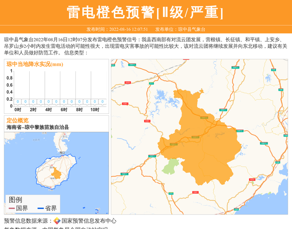 琼中县气象台发布雷电橙色预警[Ⅱ级/严重] 相关文章