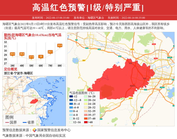 海曙区气象台2022年8月15日8时35分发布高温红色预警信号:受副热带高压影响,预计今天除西部高海拔山区外,我区所有镇乡(街道)最高气温可达39~40℃,局部41℃以上,请注意防范持续高温对农业、交通、电力、用水、人体健康等的不利影响。 信息来源:国家预警信息发布中心; 发布单位:海曙区气象台。