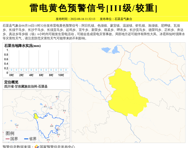 石渠县气象台08月16日11时32分发布雷电黄色预警信号:阿日扎镇、色须镇、蒙宜镇、温波镇、虾扎镇、洛须镇、尼呷镇、瓦须乡、长须干马乡、长沙干马乡、长须贡马乡、起坞乡、宜牛乡、新荣乡、格孟乡、呷衣乡、长沙贡马乡、德荣玛乡、正科乡、奔达乡、真达乡等乡镇(场)6小时内可能发生雷电活动,可能会造成雷电灾害事故。局部地方还可能伴有阵性大风、冰雹和短时强降水等灾害性天气,请注意防范灾害性天气可能带来的不利影响。 信息来源:国家预警信息发布中心; 发布单位:石渠县气象台。