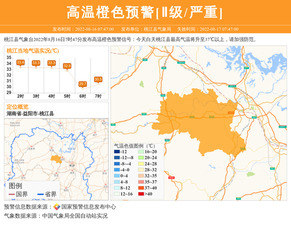 桃江县气象台2022年8月16日7时47分发布高温橙色预警信号:今天白天桃江县最高气温将升至37℃以上,请加强防范。 信息来源:国家预警信息发布中心; 发布单位:桃江县气象局。