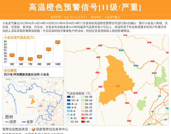 小金县气象台2022年08月16日10时19分对2022年08月08日10时17分发布的高温橙色预警信号进行第8次确认:预计小金县八角镇、沃日镇、宅垄镇、美兴镇、日尔乡、沙龙乡等乡镇未来24小时内最高气温将升至35℃以上。高温环境下作业和需要长时间户外露天作业的人员应采取防暑降温措施;午后高温时段尽量避免户外活动,特别注意老弱病幼人群的防暑降温。 信息来源:国家预警信息发布中心; 发布单位:小金县气象台。